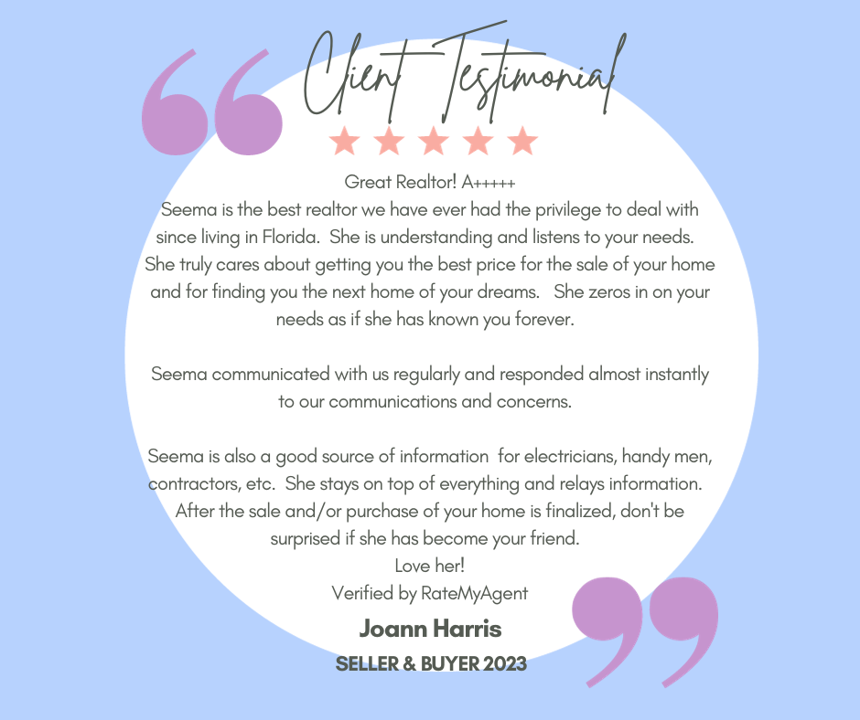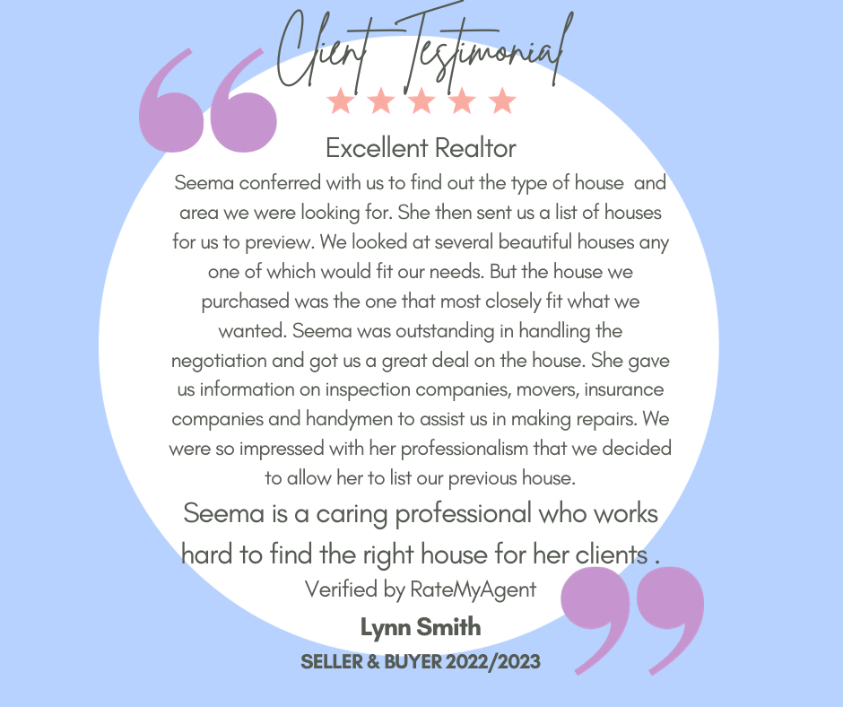 “Seema did a great job helping me find what I was looking for in a home. Organized, knowledgeable and friendly.”